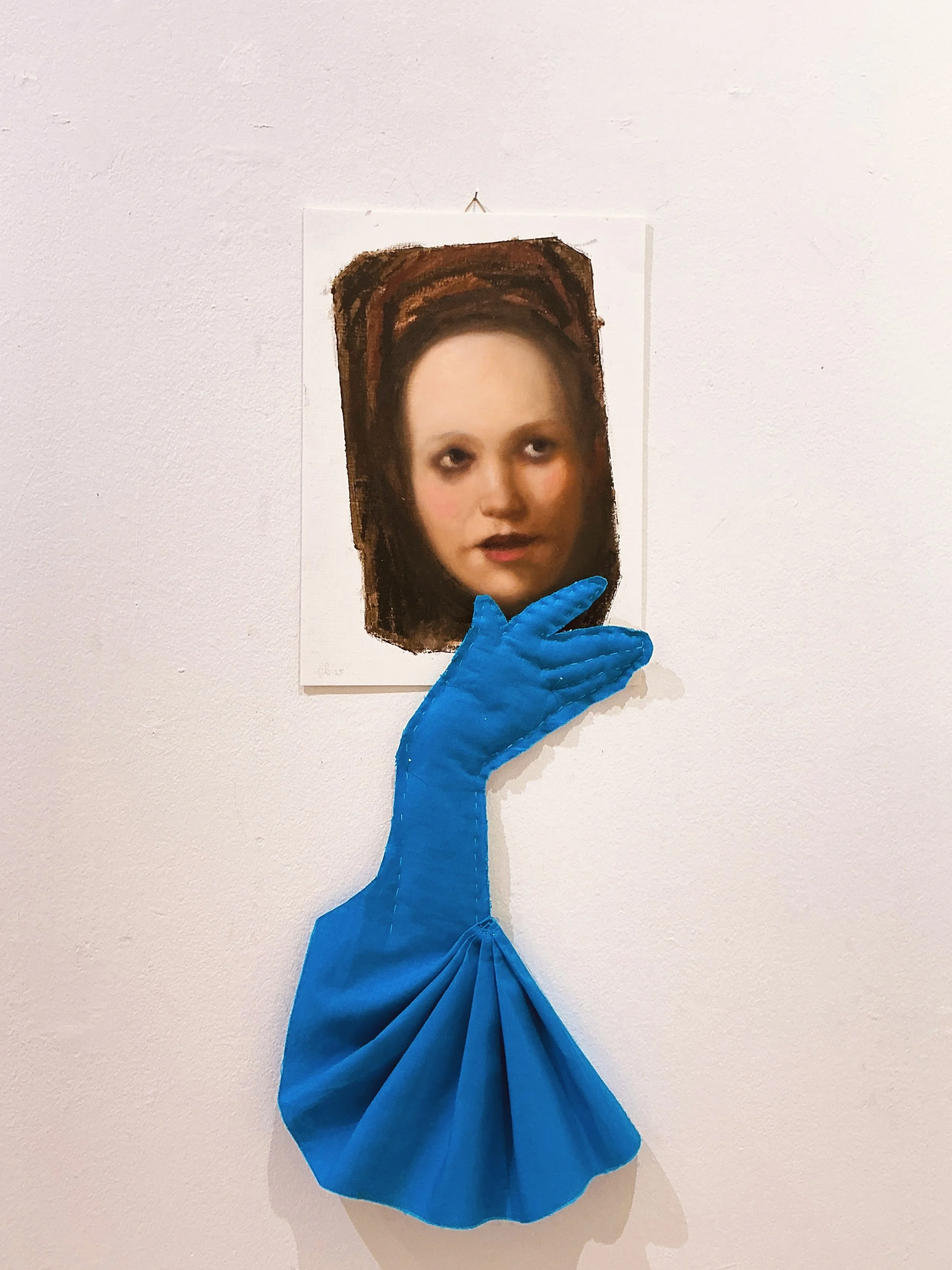 Eine Neugierige, Oil on paper canvas and quilted fabric, ca. 30 x 60 cm, 2025