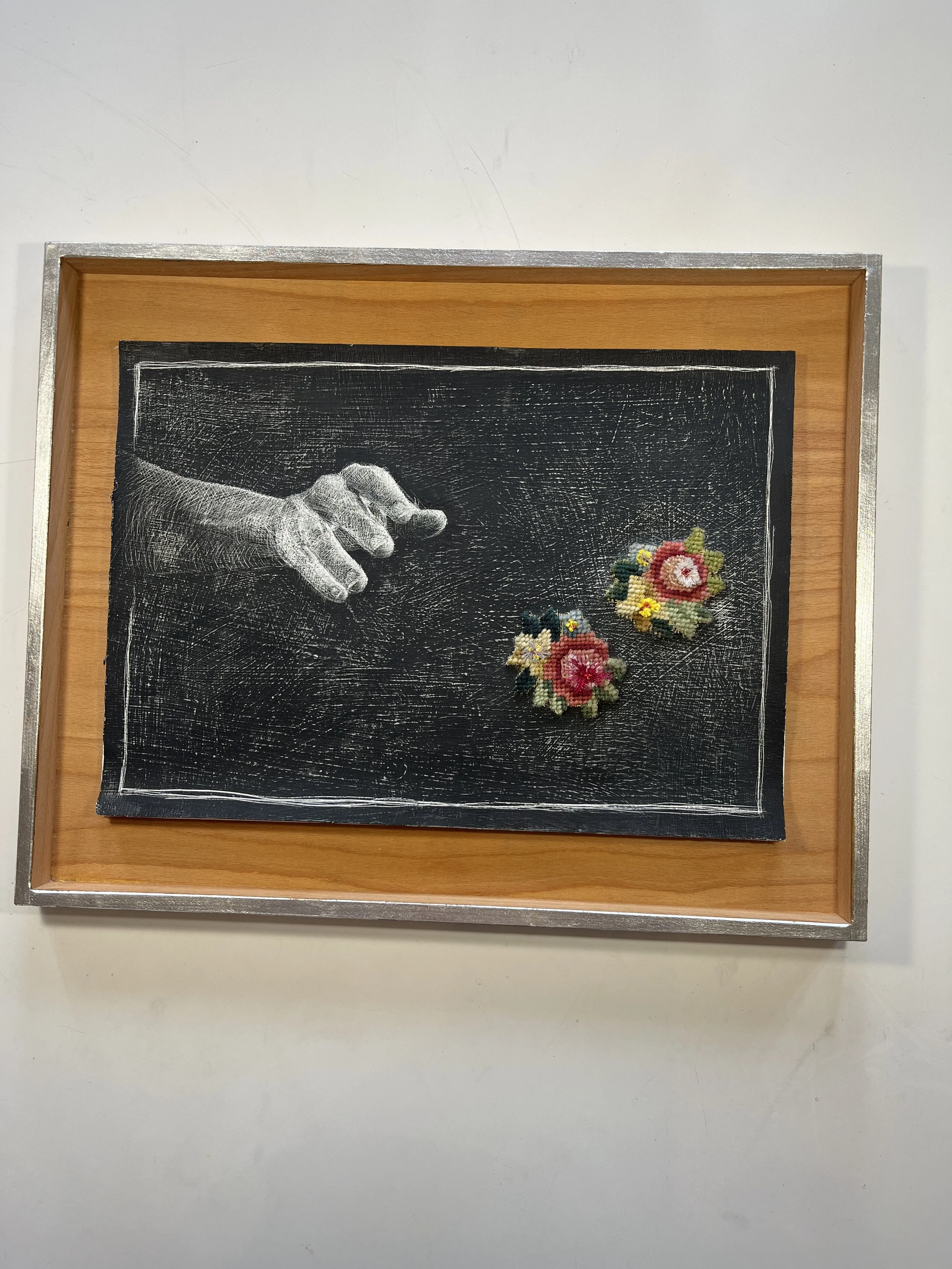 Pencil and needlepoint on canvas, silver-plated wood frame, 50cm x 40cm, 2023